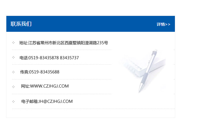 地址:常州市新北區友邦商務大廈1幢16、17層  電話:0519-85101652  傳真:0519-85112595  郵編:213022  網址:www.cz-jiayue_cn.75elite.com  郵箱:xiajifengaa@163.com